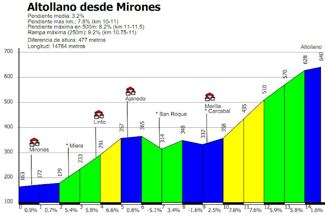 Los primeros km pasan por 3 poblaciones (Mirones, Linto y Ajanedo) y dejan un cruce en el km 2 (que nos lleva también a Estranguada por Miera) y tienen una pendiente suave pero constante en torno al 6-7-8%.